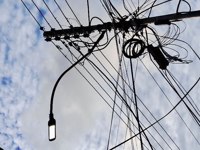 - "A low-angle shot captures a chaotic network of power lines and a street lamp against a cloudy sky" by FM-2tAXJ2, licensed under CC BY 4.0