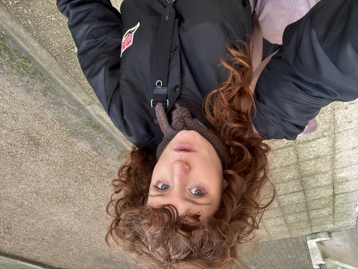This image captures a female subject taking a selfie outdoors in Suresnes, France. The subject has curly reddish-brown hair with bangs, blue eyes, fair skin with visible freckles, and a small silver nose ring in her left nostril. Her lips are slightly parted. She is wearing a dark brown knitted neck warmer and a black bomber jacket. A multi-colored patch, primarily pink, white, and yellow, is affixed to the upper left sleeve of her jacket. A black strap, likely from a bag, diagonally crosses her chest, and a light pink or beige bag is visible on her back. The background features two distinct ground surfaces: light grey concrete paving slabs on the left and a lighter, gravel-like surface on the right, separated by a curb with minimal green vegetation. A light-colored concrete or stone wall or railing is visible in the upper left portion of the background. The scene is illuminated by overcast light.