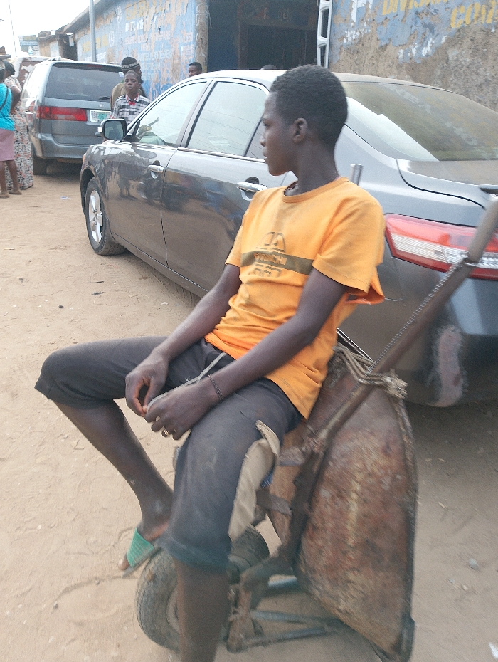 A young person in an orange t-shirt sits on a rusty, weathered cart in a dusty outdoor setting. They wear dark shorts and a single green sandal. The person looks off to the side, seemingly relaxed. A gray car is parked behind them, with a red van visible further back. People stand in the background, adding to the sense of a populated area, although their faces are difficult to distinguish. A building can be seen in the back.