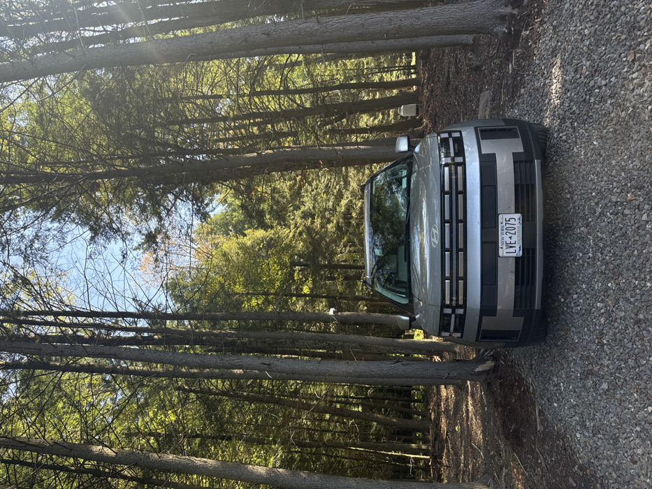 A silver Hyundai IONIQ 5 electric SUV is parked on a gravel surface in a densely wooded area in Otego, United States