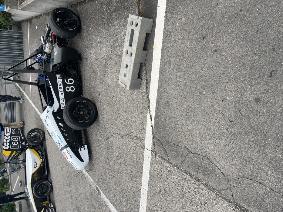 The image displays an outdoor paved area, identified as the Czech University of Life Sciences Prague campus in the Suchdol district of Capital City of Prague, Czechia, indicated by vehicle branding. Two open-wheel, single-seater race cars are parked on gray asphalt pavement. The primary vehicle, positioned right of center, is white and black with the number "86" on its side and "CULS IN PRAGUE" text. Its rear section reveals exposed engine components, and it is fitted with black multi-spoke wheels. Behind and to the left of this car, a second white and yellow race car, bearing the number "168" and "CZU" branding, is also parked. A horizontal white line is painted across the cracked and worn asphalt in the mid-ground. To the right of this line, a rectangular gray concrete block with various depressions and holes rests on the pavement. In the background, three individuals are standing near stacked metal crowd control barriers and a light-colored concrete wall, with green foliage visible. The scene is under overcast natural light.
