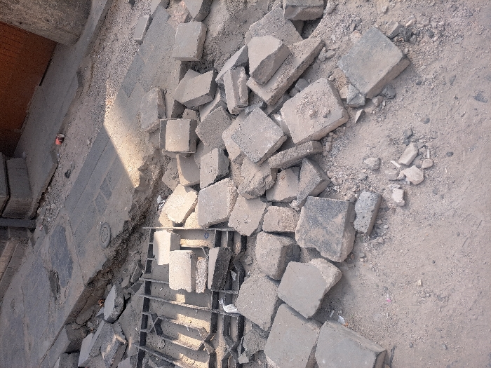 The image depicts an outdoor urban scene in the city of Unknown, Unknown, characterized by significant ground disturbance and construction debris. No individuals are present. In the foreground and midground, a substantial pile of broken, irregular grey concrete pavers and fragments occupies the lower two-thirds of the frame. These pieces vary in size and shape, displaying exposed aggregate and some darker, possibly weathered surfaces. The ground beneath and around this pile consists of light brown, dusty soil mixed with smaller debris. To the left, partially obscured by the concrete, lies a dark-colored, rectangular metal grate with a geometric pattern, likely a utility cover or trench grate. A rough, excavated edge or trench separates the foreground debris from an elevated background area. This background area features a damaged concrete sidewalk or paved surface, uneven and showing cracks and dirt accumulation. A circular metal manhole cover is visible embedded in this pavement. Further back on the pavement, a single reddish-orange plastic cup lies on its side. Sharp shadows fall across the paved surface and part of the debris pile, indicating direct sunlight from the upper right. The background also reveals portions of dark, textured building facades or walls on both the left and right sides of the frame. The overall environment suggests an active construction or demolition site, or an area undergoing significant public infrastructure repair.