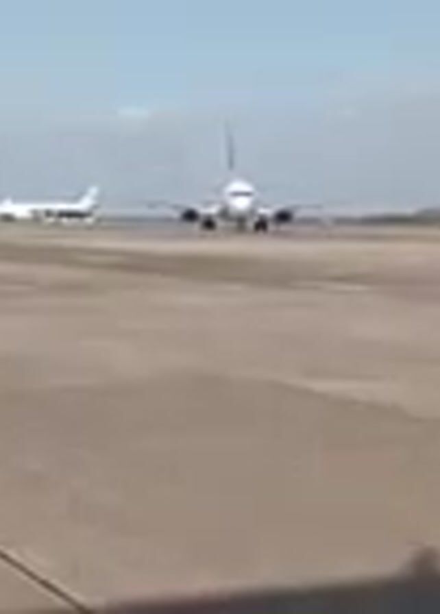 passenger jet moving slowly on a concrete runway. The plane is white with dark markings. There are other aircraft visible in the background, also on the runway. The sky is light blue with some thin clouds. The camera is stable, and the scene is viewed from a low angle.