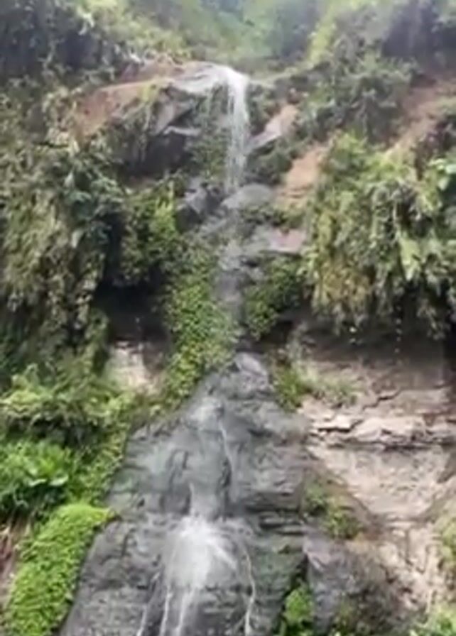 medium shot of a small waterfall cascading down a rocky, moss-covered hillside. The water falls in multiple streams, hitting different levels of rock before continuing its descent. The hillside is densely vegetated with various green plants, including mosses and ferns, clinging to the rock. The weather appears overcast, contributing to the lush, wet environment. No people or animals are visible in the frame.