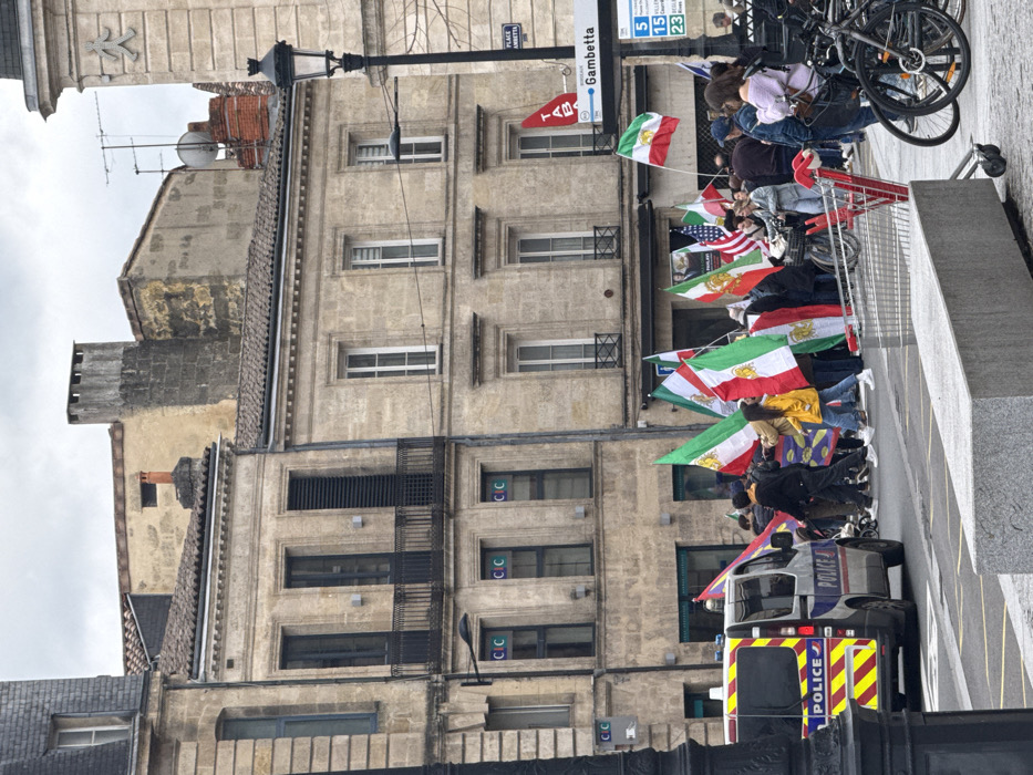 The image displays a street scene at Place Gambetta in Bordeaux, France, under an overcast sky. A group of individuals is moving from left to right across the street, with many carrying flags. Multiple Iranian flags, characterized by green, white, and red horizontal stripes with a central lion and sun emblem, are prominent. An American flag is also visible within the group. A grey and blue French police van, marked with "POLICE" and featuring yellow and red chevron striping on its rear, is positioned on the left side of the street. In the foreground, a grey concrete barrier is visible, with a red shopping cart and several bicycles located to its right. The background is composed of multi-story, light-colored stone buildings typical of Bordeaux, featuring numerous windows, some with shutters and wrought-iron balconies. A street sign identifying "PLACE Gambetta" is affixed to a dark lamppost on the right. One building displays "CIC" logos in its lower windows, and another shows a red banner with "TABA" from an upper window.