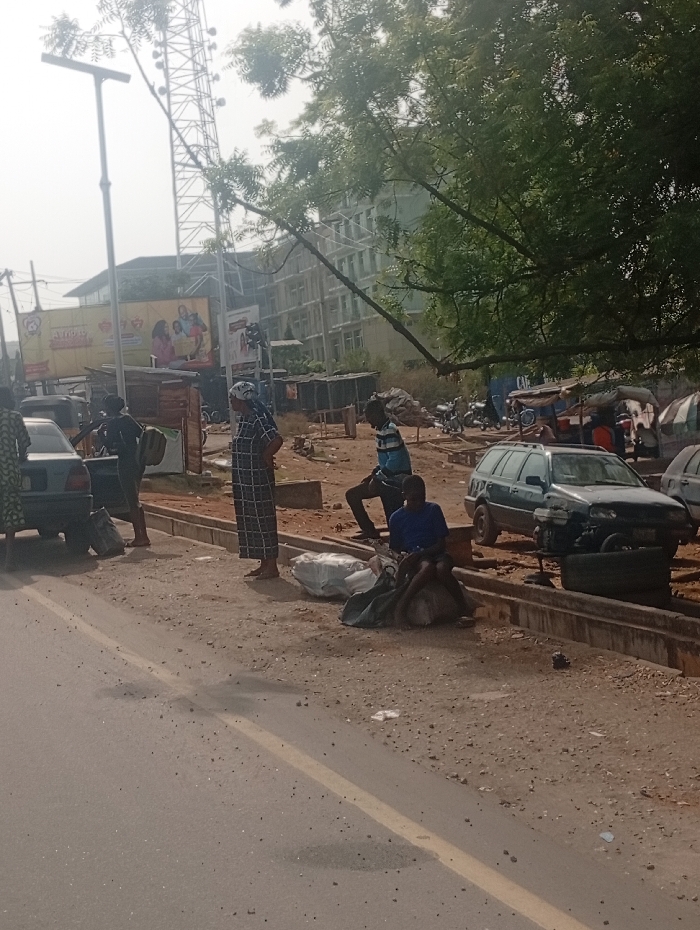 The image captures a bustling roadside scene in Adankolo, Nigeria, under bright, hazy daylight