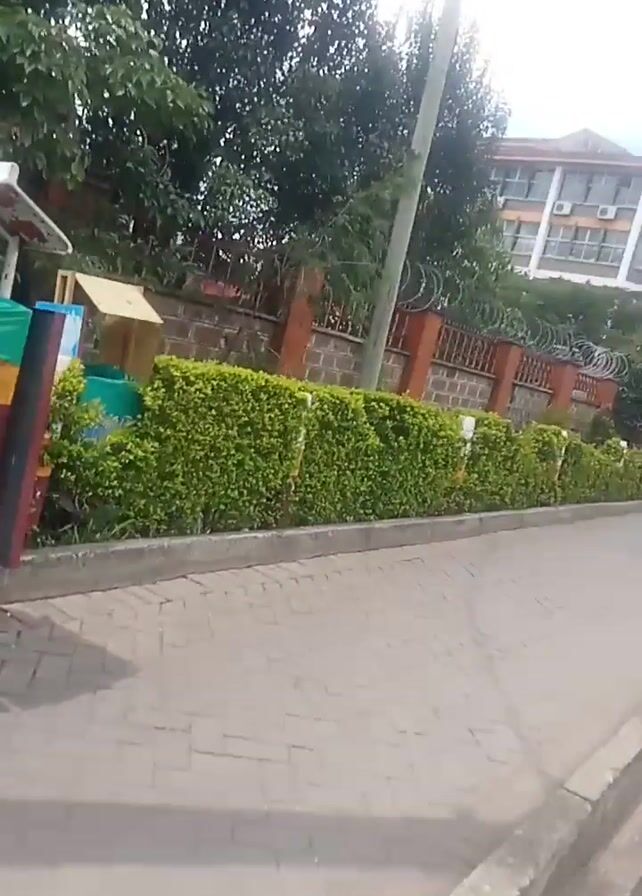 medium shot of a sidewalk next to a hedge. The camera moves, and a woman wearing a green and white striped top, black pants, and sandals walks by on the sidewalk carrying a red bag. She appears to be looking down. In the background, there is a building and a few people walking in the distance.