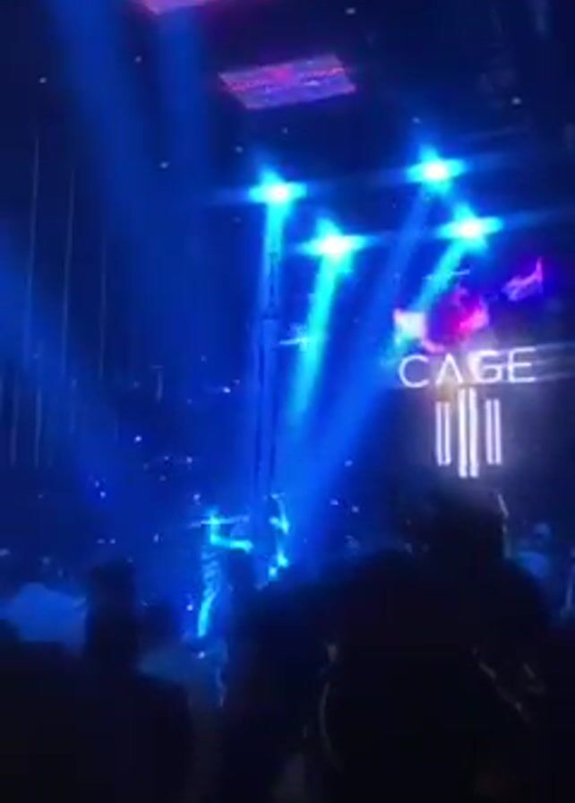 The video depicts a dark, crowded nightclub called "Cage." A stage is visible, with two people performing. Blue and white lights scan the crowd, while square-shaped pink and red LED screens illuminate the ceiling. A large screen behind the performers displays the club's name with animated visuals. People are visible in the foreground. The overall ambiance is lively and energetic.