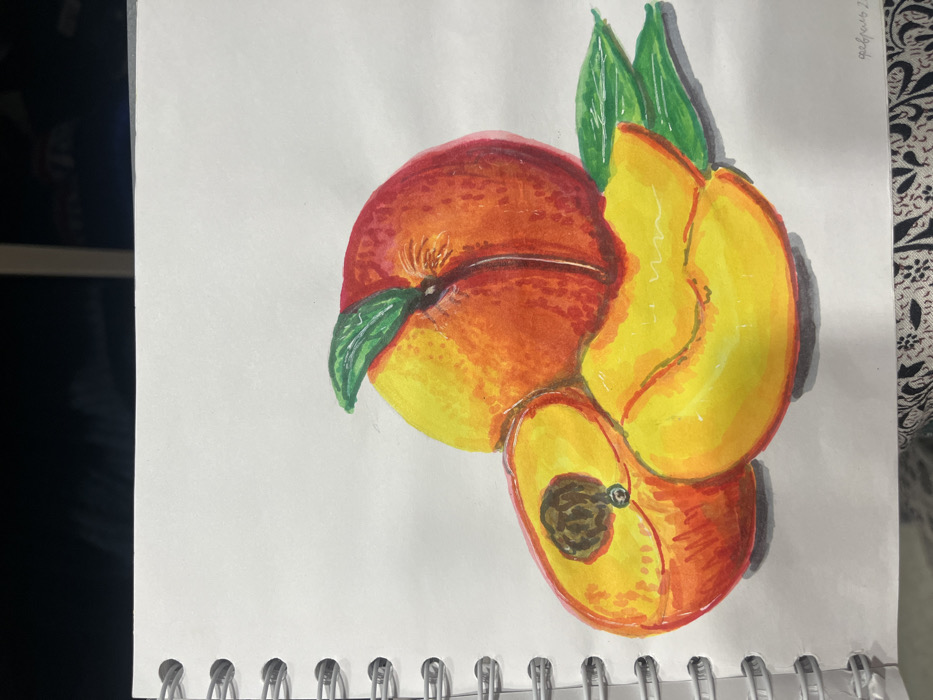 - "A photograph, purportedly taken in Ново-Никольское, Russia, presents a close-up, slightly angled view of a colorful drawing of peaches rendered on a white sheet within a spiral-bound notebook" by FM-rZtew2, licensed under CC BY 4.0