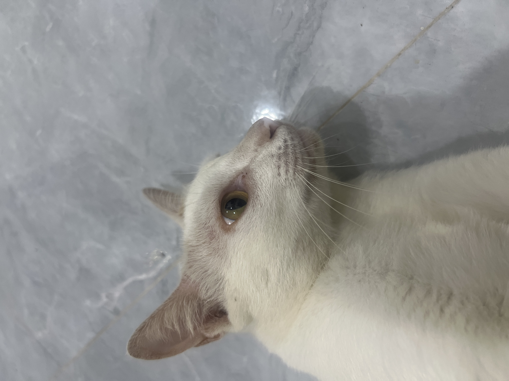 A white domestic cat lies on a light grey tiled floor with subtle darker grey marbling and visible grout lines, within an indoor setting in Cam Đức, Vietnam. The cat's head is presented in profile, facing right, displaying white fur, amber-yellow eyes with circular black pupils, a pink nose, and pink inner ear tissue. Small dark cutaneous marks are visible in the periorbital and supraorbital regions of its right eye. The lighting is even, suggesting an interior light source.