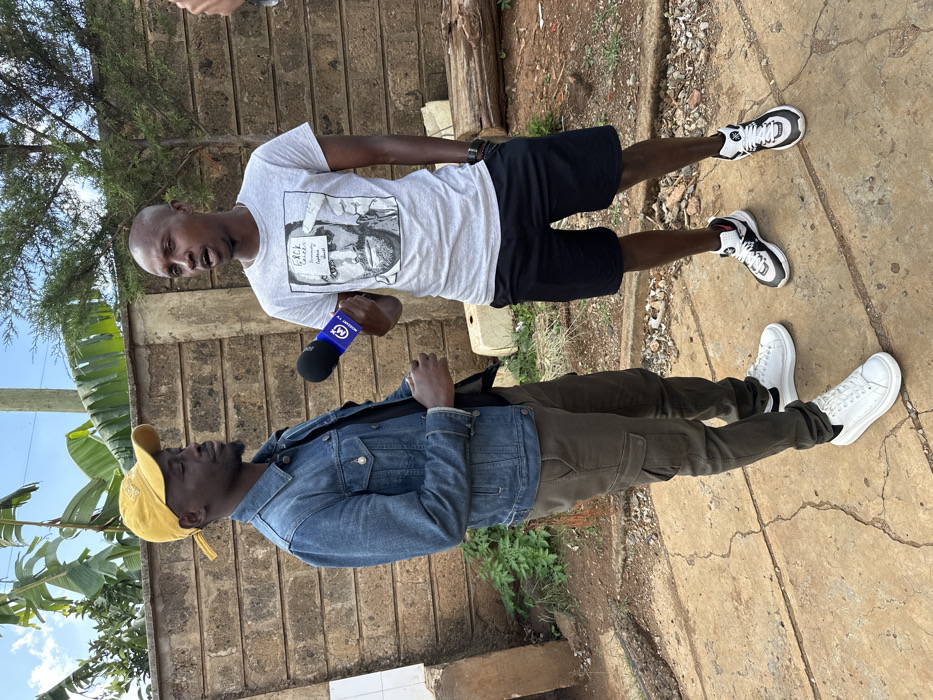 Two adult males are depicted outdoors, engaged in an interview in a semi-urban setting within Nairobi, Kenya