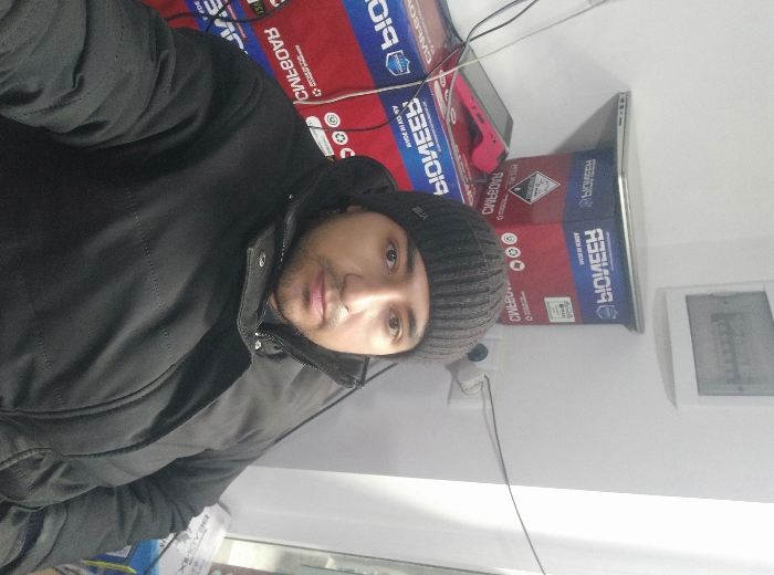 A man wearing a black beanie and a puffy black jacket takes a selfie. Behind him are stacked boxes of Pioneer brand products, a pink device (possibly a Nintendo Switch), and a laptop. The background also includes a window with frosted glass and a white wall with an electrical outlet. The image is slightly rotated counterclockwise.
