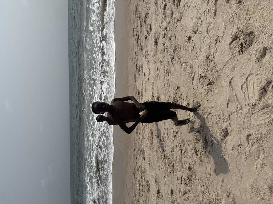 The image depicts a sandy beach scene in Mopo-Akinlade, Nigeria, under an overcast or hazy sky. Two dark-skinned young males are present on the beach. In the foreground, a young male is captured in mid-stride, appearing to move from right to left across the frame. He is shirtless, wearing dark shorts, and is barefoot. His left leg is lifted, and his right foot is on the sand. He holds a light-colored object, consistent with a peeled banana or similar fruit, in both hands at his waist level. His gaze is directed towards the camera. A distinct shadow extends to his left on the sand. Further back on the beach, closer to the waterline and slightly to the left of the foreground individual, a second young male is partially visible and slightly out of focus. He also appears to be shirtless. He stands facing generally towards the foreground individual or slightly beyond, with his body partially obscured. The beach itself consists of light-brown sand, showing numerous footprints in the foreground. Behind the individuals, the ocean features moderate white-capped waves breaking towards the shore. The sky above the ocean is a uniform light grey-blue, indicating bright but diffused lighting conditions.
