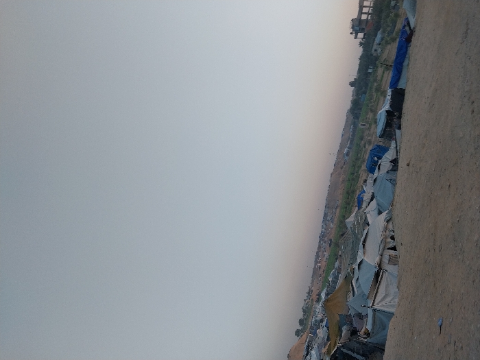 The image displays an expansive informal settlement or camp in Deir el-Balah, Palestinian Territory, under a pale, gradient twilight sky