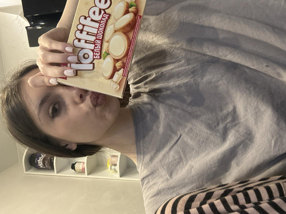 The scene depicts a young adult female indoors in Kudrovo, Russia. She possesses long, dark brown hair and is attired in a light grey short-sleeved top; a striped garment featuring black and light pink/beige stripes is visible on her left arm. She holds a white Toffifee confectionary box, labeled with "Toffifee" and "БЕЛЫЙ ШОКОЛАД" (White Chocolate) in Russian, with her right hand. The box partially obscures her face from the nose downwards. Her lips are pursed, and her fingernails display a light-toned polish. In the background, to the left, a white corner shelving unit is affixed to a light-colored wall. This unit holds a dark purple container branded "Matrix" on its top shelf, a dark bottle on the middle shelf, and a yellow container with an additional small bottle on the bottom visible shelf. To the right of the subject, a dark, reflective surface is partially visible.