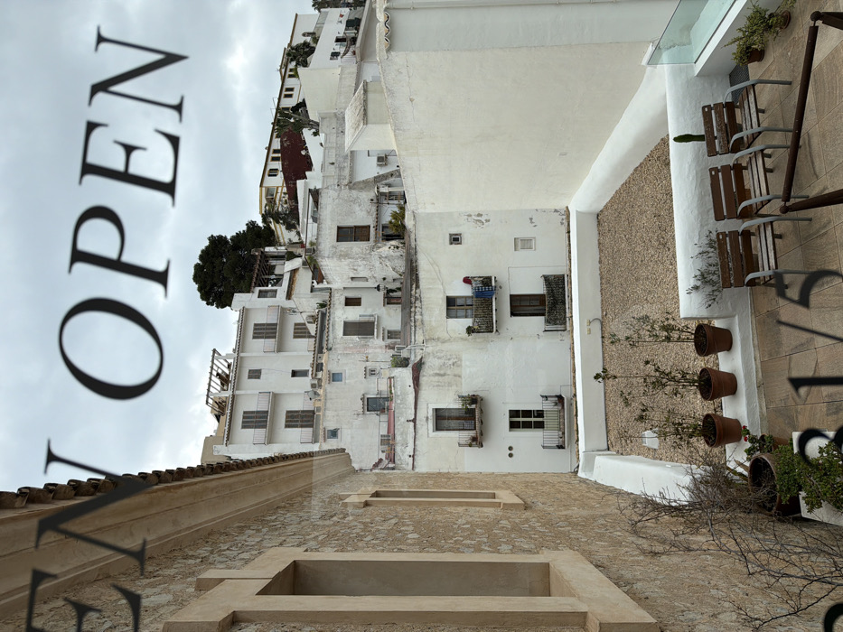 An exterior scene in the Dalt Vila, Ibiza Town, Spain, is viewed through a glass pane with the reflected word "OPEN" across the top