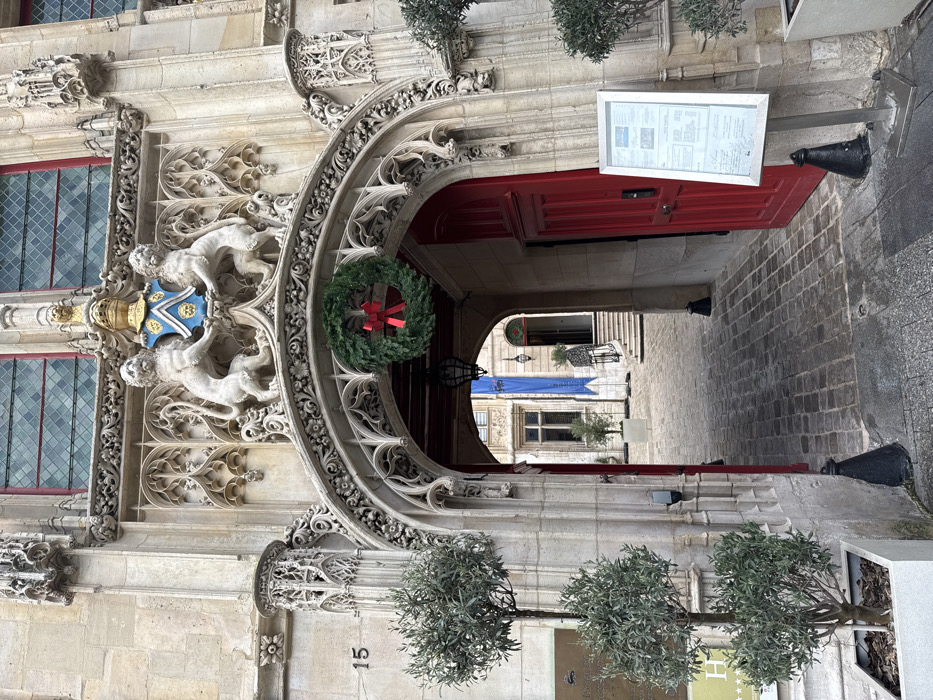 The image displays the ornate Gothic entrance of the Hôtel de Bourgtheroulde, located at number 15 in Rouen, France. A highly detailed stone archway, carved with intricate tracery and floral patterns, forms the primary passage. Above the arch, a stone escutcheon features two white lions rampant supporting a blue and gold shield with three golden fleurs-de-lis, surmounted by a golden helm. Below this crest, a green Christmas wreath with a red bow hangs centrally within the archway. To the left of the arch, the number "15" is carved into the stone façade, and two manicured olive trees in white rectangular planters stand on the pavement. A dark red wooden door, slightly ajar, is situated on the right side of the archway, immediately adjacent to a white-framed, free-standing menu stand displaying text. The archway leads into a cobbled interior courtyard. Visible through the archway are additional stone building elements, a blue banner hanging on the left, and a stone staircase ascending on the right. A dark, wrought-iron lantern is suspended from the archway's ceiling. Two black, conical doorstops are positioned on the cobblestone floor within the passage. No people are present in the scene.