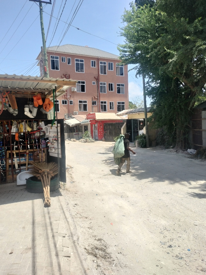 The image captures an outdoor street scene in Dar es-Salaam, Tanzania, under clear, sunny daytime conditions