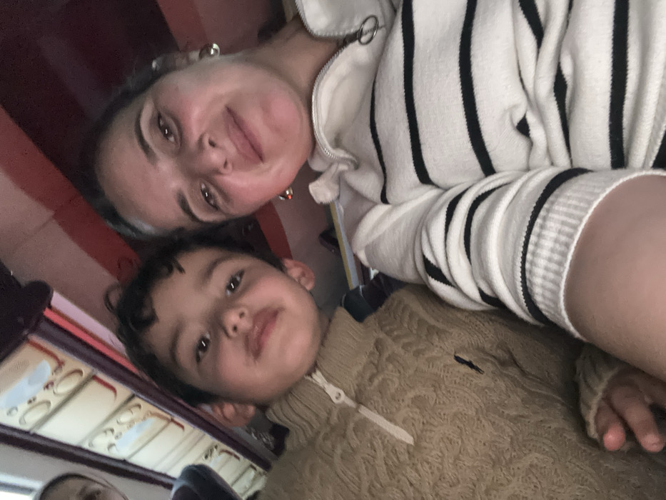 A woman and child pose closely in a selfie. The woman, on top, wears a white sweater with black stripes and silver earrings. The child, below, wears a brown cable-knit sweater with a partial zipper. Their faces are directed toward the camera, showcasing their features. The background is blurred, but elements of a room interior are visible with hints of red and white.