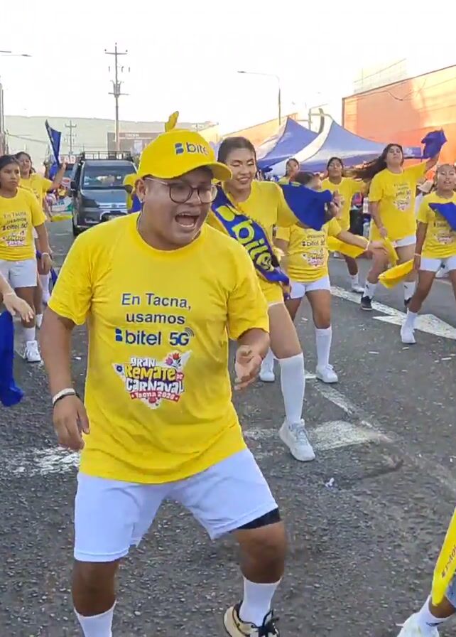A group of children and adults are dancing in a street parade. The dancers are wearing yellow shirts with the words "En Tacna, usamos bitel 5G" and "GRAN REMATE CARNAVAL 2020." They are also wearing white shorts or blue denim shorts and white shoes. The adults are wearing yellow hats. The children are holding blue cloths. The street is crowded with spectators. There is a yellow car in the background. There is a sign that says "FERIA 28 DE JULIO" in the background. The dancers are smiling and appear to be enjoying themselves. The day seems to be sunny.