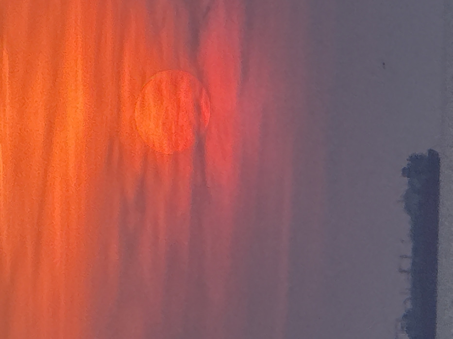 The scene depicts a coastal area in Alexandroupolis, Greece, at dusk. The sky occupies approximately 75% of the frame, presenting a vivid sunset gradient. The upper portion exhibits an intense orange coloration, which transitions downwards through deep red into a purplish-pink hue closer to the horizon. A distinct, diffuse, circular deep red-orange solar disk is centrally positioned in the upper-middle sky, partially obscured by atmospheric haze or thin clouds, which appear as subtle horizontal striations across the upper and middle sky. The lower 25% of the image features a calm body of water, colored a muted grayish-purple, meeting the sky at a defined horizon line. A large, dark, silhouetted vessel, consistent with a cargo ship or tanker, rests on the water surface in the lower-left quadrant. Its superstructure details are indistinct due to the backlighting. A small, dark, unidentifiable flying object is faintly discernible in the lower-right sky, above the water. No individuals are visible.