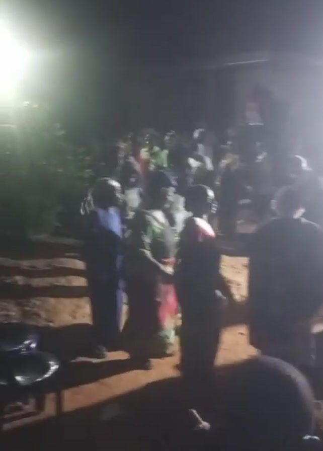 gathering of people outside at night. They appear to be dancing or moving to music, though details are obscured by darkness and bright light. There's a light source from above. The ground seems to be dirt.