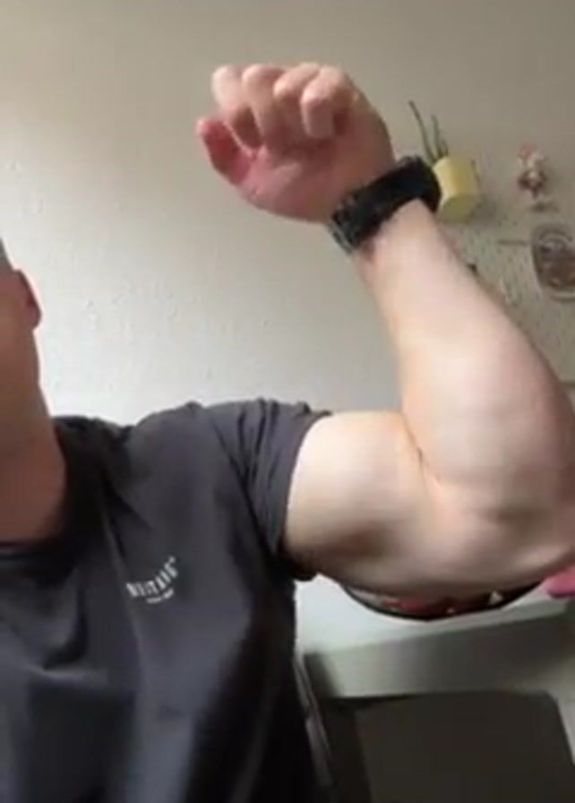 - "A man with a shaved head and mustache, wearing a black t-shirt and a watch on his left wrist, flexes his right bicep" by FM-qvTDD3, licensed under CC BY 4.0
