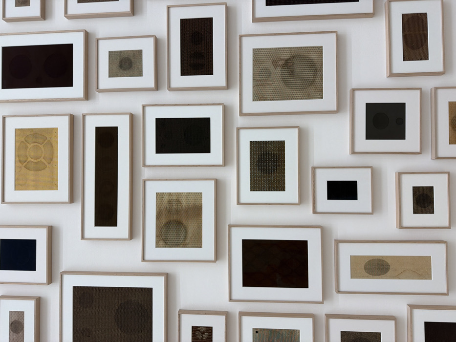 A white wall displays an array of framed artworks in varying sizes. The frames are light wood with a white border. The artwork inside includes dark geometric shapes, patterns resembling speaker grills, and subtle textures with faded circular impressions. The arrangements appear unplanned, giving a gallery-like atmosphere with a blend of abstract and minimalist styles.