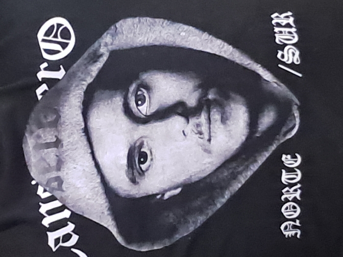- "A black t-shirt features a grayscale image of a person wearing a hood, possibly Tupac Shakur" by FM-2tAXJ2, licensed under CC BY 4.0