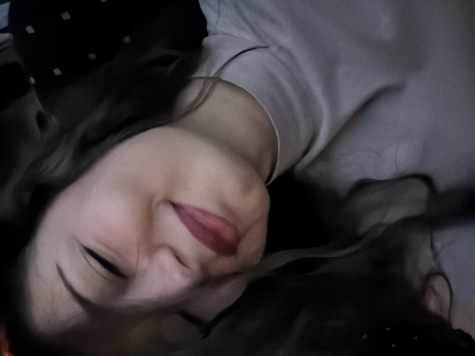 A dimly lit, close-up shot of a woman's face angled slightly downward. Her eyes are partially closed, and she wears a subtle, reddish-pink lipstick. Wisps of dark hair frame her face. She wears a light-colored, possibly grey or pink, top. The background is dark, with a textured black surface spotted with white, likely a cushion or blanket. The overall image evokes a sense of intimacy and relaxed mood.