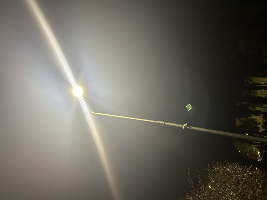 The image presents a nighttime scene in Veliko Tarnovo, Bulgaria, under conditions suggestive of haze or fog, causing light diffusion. A prominent dark-colored street lamp pole extends vertically from the lower-center-left upwards, reaching near the top of the frame. At the peak of this pole, a highly intense, yellowish-white LED street light emits a strong radiance, creating significant starburst lens flares that streak across the upper sky. To the right and slightly below the primary street light, a distinct, smaller, square-shaped green light array is visible, composed of a grid of multiple individual green LEDs. In the lower-left foreground, bare tree branches are discernable. The lower background reveals faint, dark silhouettes of buildings and additional trees, subtly illuminated by ambient light. No individuals or specific actions are visible.