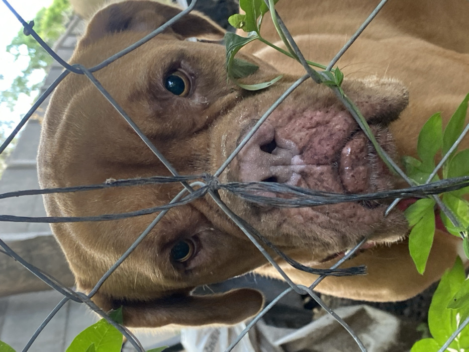- "A brown dog with a wrinkled face peeks through a chain-link fence entangled with green leafy vines" by FM-hyDqt1, licensed under CC BY 4.0