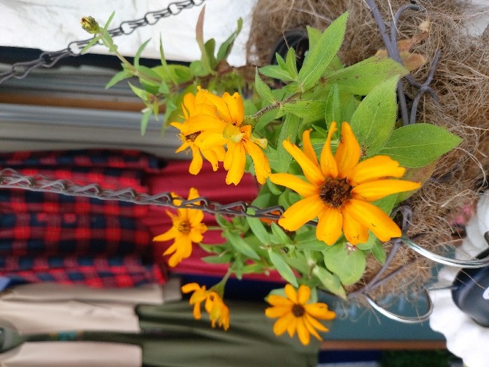 - "This image presents a close-up, eye-level view of a hanging basket displaying multiple orange-petaled flowers with dark brown centers, consistent with *Bidens ferulifolia*" by FM-xMf1b2, licensed under CC BY 4.0