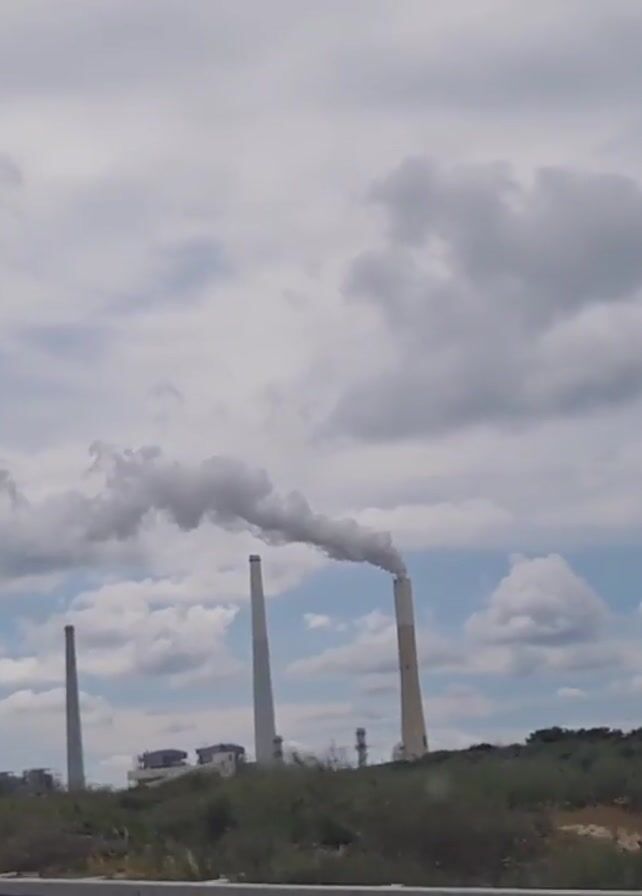 view from inside a moving car, focusing on an industrial landscape. In the background, four tall chimneys stand prominently against a cloudy sky, with smoke billowing from one of them. Closer to the road, a yellow highway sign is visible, displaying directions in Hebrew, Arabic, and English, indicating an exit for "To OR AQIVA" at the "QESARIYYA INTERCHANGE." In the foreground, low-lying vegetation and a few electrical pylons are also visible.