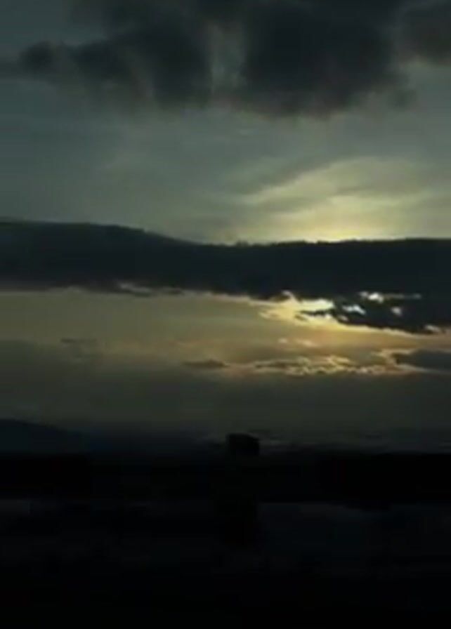 landscape in winter at dusk. The foreground is obscured by a dark silhouette, slowly revealing a snow-covered field. As the camera pans, trees and the frame of a small building come into view, all dusted with snow. Above, the sky is a blend of blue and grey, with dark clouds partially obscuring the setting sun. The overall mood is somber and still.