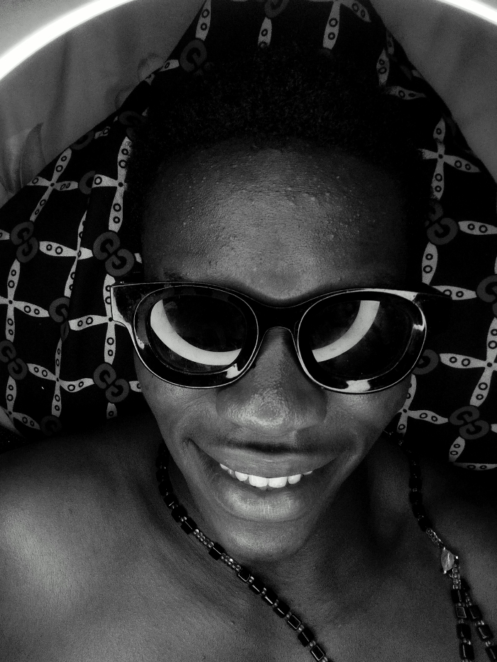 A close-up, black and white portrait features a person wearing large, dark sunglasses with a visible reflection. They smile, revealing their teeth. A patterned head covering, possibly a scarf or bandana, drapes over the back of their head. A necklace with dark beads adorns their neck. The subject is positioned in front of a circular light source, casting a glow.