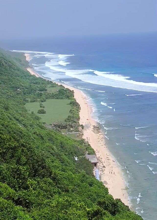 From a high vantage point, a coastal scene unfolds. Lush, green vegetation dominates the left side, sloping down to a beach lined with scattered individuals. The beach stretches along the frame's center, where waves with white crests roll in from the blue ocean, extending to the horizon. The sky overhead is a soft, muted blue.