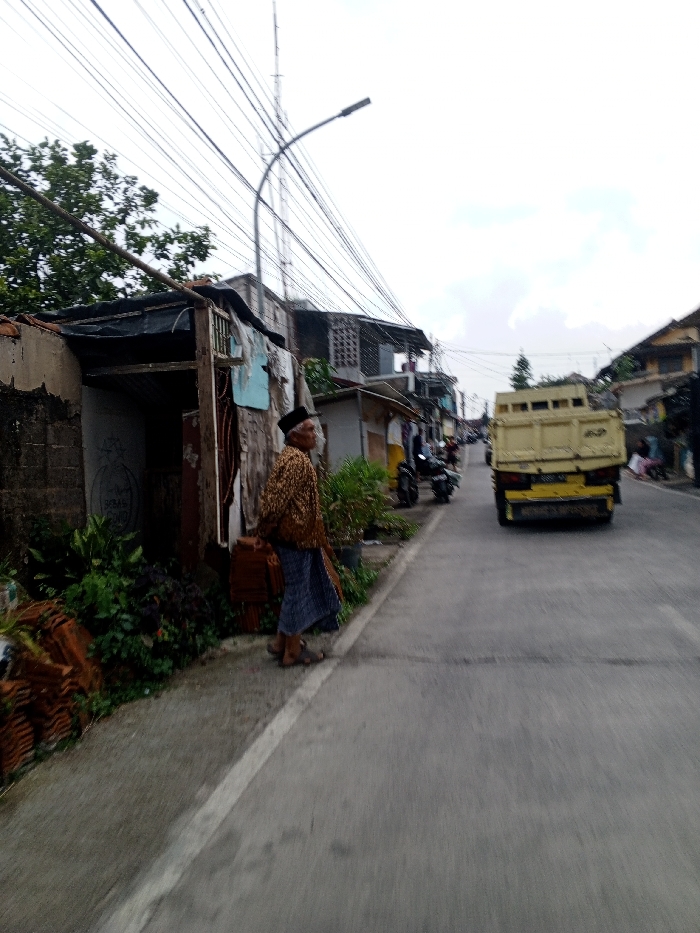 The image displays an urban street scene in the city of Kheda, India, under an overcast sky. An elderly individual, possibly male, stands on the paved sidewalk in the mid-left foreground. This person is dressed in a dark patterned long-sleeved shirt, a blue patterned sarong-like lower garment, and a black cap, with open-toed sandals on their feet. Their posture suggests they are looking towards the left, off-frame or down the street. To the left of the individual, a simple structure with exposed concrete block walls and a makeshift roof partially covered by a dark tarp is visible. Adjacent to this structure, a pile of reddish-brown, possibly clay, roof tiles lies on the ground, surrounded by green foliage and potted plants. A row of varied buildings, some multi-story, extends along the left side of the street into the distance. Numerous overhead utility wires crisscross the sky, with a street light extending over the road from the left. A tall lattice tower, likely a communication mast, is visible in the far background against the cloudy sky. The central and right portions of the image feature a two-lane asphalt road with a white solid lane marker. A yellow dump truck, with its bed designed with vertical slats, is observed moving away from the viewer in the right lane; its rear appears slightly blurred due to motion. Further down the street on the left, two motorcycles are parked on the sidewalk. No direct interactions between individuals or vehicles are evident.