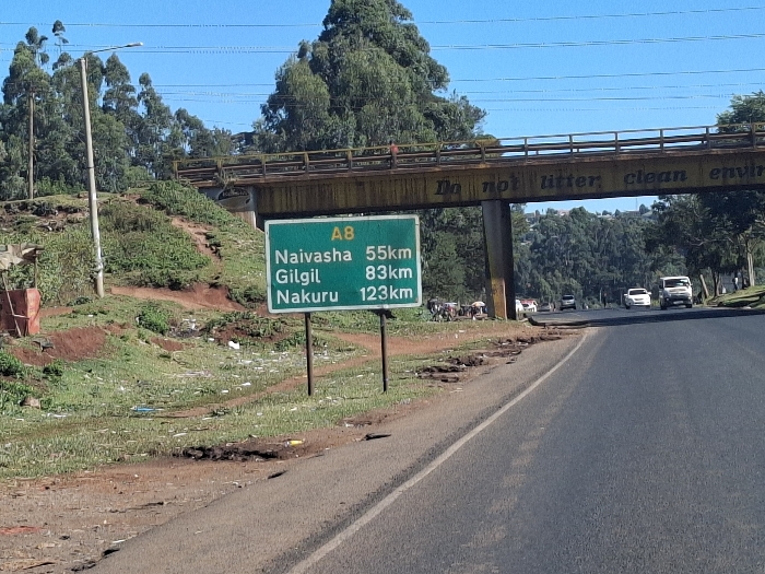scene on a highway in Limuru Town, Kenya, located at latitude -1.108 and longitude 36.631. A green road sign with "A8" on the top reads "Naivasha 55km, Gilgil 83km, Nakuru 123km." The sign is positioned on the side of the road, directly under a yellow bridge with a painted inscription, "Do not litter, clean environment." The road is asphalt, with white lane markings on the right edge of the road. Trees line the edge of the road, visible in the background. The road is mostly empty with only a few cars in the distance. There is a small gathering of people near the base of the bridge on the right side of the road. The scene is set in the daylight with a clear, sunny sky. There are patches of green grass growing on the shoulder of the road and on the ground near the base of the bridge.