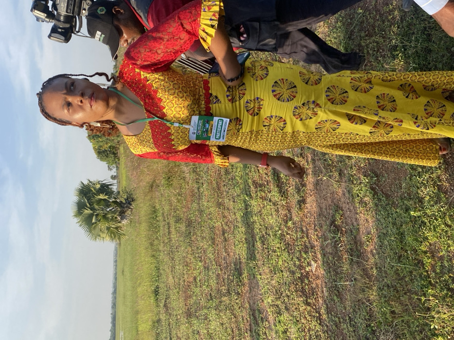 The scene is an outdoor setting in a dry, grassy field, identified as Kwarau, Nigeria. A woman stands prominently in the foreground, facing slightly left of the camera, her gaze directed towards the left. She has dark braided hair and wears a fitted, floor-length dress. The dress features a red lace overlay on the upper torso and 3/4 length sleeves, which are layered over a yellow patterned fabric. The skirt portion of the dress combines a golden-yellow honeycomb-like pattern on the viewer's left with larger, multi-colored circular burst patterns on a yellow background on the viewer's right. A green lanyard with a white identification badge, displaying "PARTICIPANT," hangs around her neck. A red smartwatch is visible on her left wrist. Partially obscured behind and to the right of the woman is a man wearing a dark cap with a white logo and a red shirt. He is positioned next to a professional black video camera mounted on a tripod, which is oriented towards the left. The background features an expansive field, a body of water, and a large palm tree with a dense crown, all under a clear, light blue sky. The lighting suggests either late afternoon or early morning.