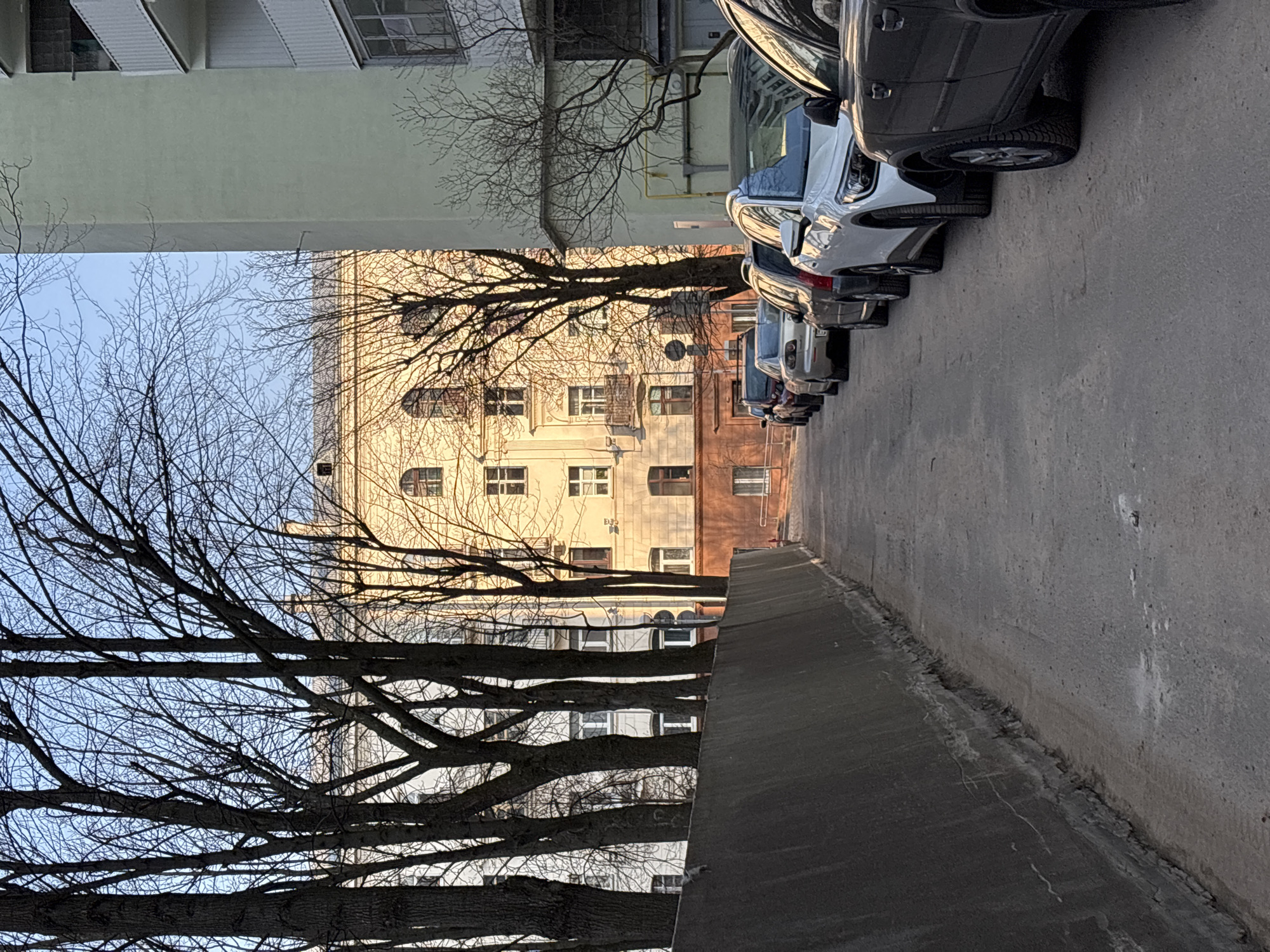 The image presents an urban scene in Minsk, Belarus, characterized by a narrow asphalt or concrete roadway extending into the distance under clear, light blue skies. The lighting suggests early morning or late afternoon, with low-angle sunlight illuminating the background structures. On the left side of the roadway, a dark gray concrete retaining wall with visible surface wear and crumbling at its base parallels the road. Beyond this wall and partially obscuring the view are several deciduous trees with bare branches, their dark silhouettes prominent against the sky and buildings. On the right side of the roadway, a line of several parked vehicles is visible, extending into the background. The closest vehicle, partially visible on the far right, is a dark-colored SUV. Immediately behind it is a white SUV, followed by a dark sedan, a red car, and a silver sedan, among others. In the background, a multi-story building with a light beige or pale yellow facade and numerous windows, some arched, is brightly illuminated by the sun. To the left of this building, partially obscured by trees, is a white multi-story building. On the far right of the background, a tall, pale green modern apartment building with multiple balconies stands prominently. No individuals are present, and no dynamic actions are depicted within the frame. The scene is static, devoid of human presence or interaction.