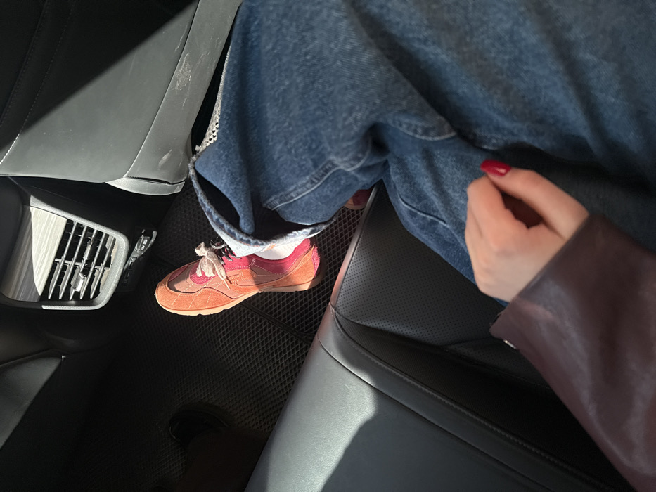 A view inside a car, looking down at a person seated. The individual wears blue, wide-legged jeans and a reddish-brown sneaker with light laces. A glimpse of white socks is visible. A hand with red nail polish is poised near the person's lap, adorned with a burgundy leather jacket sleeve. The car interior includes dark seats, air vents, and patterned floor mats. Light streams in, illuminating the scene.