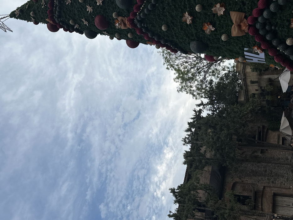 A low-angle shot captures a vibrant Christmas tree laden with ornaments and garlands, contrasting against a cloudy sky. Adjacent to the tree, trees and a stone building adorned with climbing plants rise, adding depth to the composition. Tables and umbrellas hint at an outdoor setting, possibly a market or gathering place. The perspective emphasizes the height of the tree and the expansive sky.