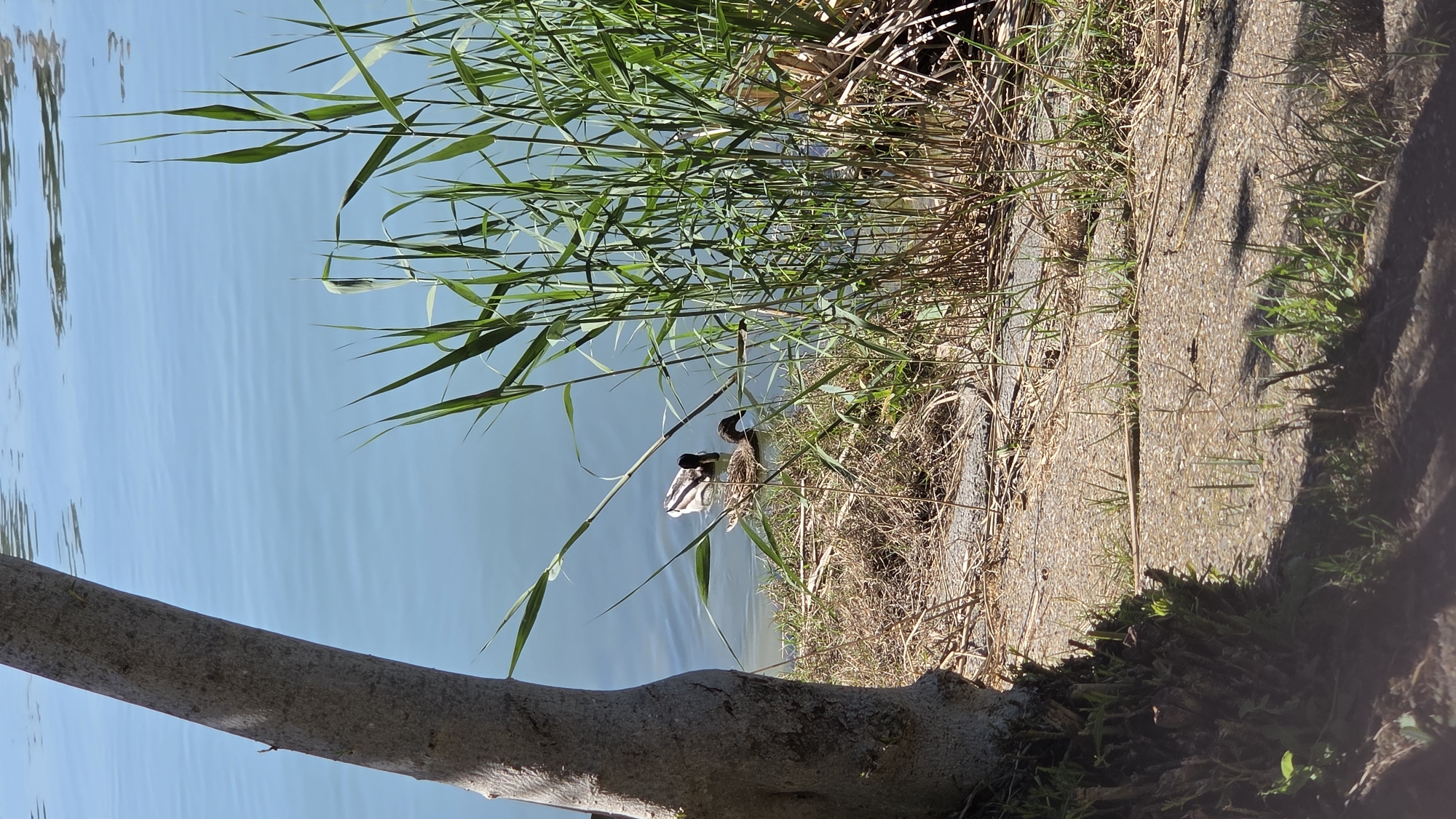 The image displays a tranquil waterside scene, likely situated along the Guadalquivir River or within an urban park adjacent to it in Seville, Spain. The upper half of the frame is dominated by a calm body of light blue water with subtle ripples, indicating stillness or slow current. Two ducks are present near the water's edge. The duck positioned further out exhibits dark and white striped markings on its tail section, consistent with a male Mallard, its head submerged beneath the surface, suggesting foraging. Closer to the viewer, a second duck, mottled brown in coloration and consistent with a female Mallard, also has its head submerged, engaged in similar activity near the bank. Along the right side of the water, a dense cluster of tall, green, blade-like reeds grows directly from the water, extending vertically. A narrow strip of dry, grassy earth forms the immediate bank, leading to a light-colored, textured concrete or gravel path that traverses the lower third of the image. Patches of green grass are visible growing through cracks in the path. A thick, light-barked tree trunk occupies the left foreground, extending vertically from the bottom edge upwards, its base showing pruned branches. The tree casts a shadow onto the path, indicating direct sunlight from the upper right. No human subjects or interactions are depicted.