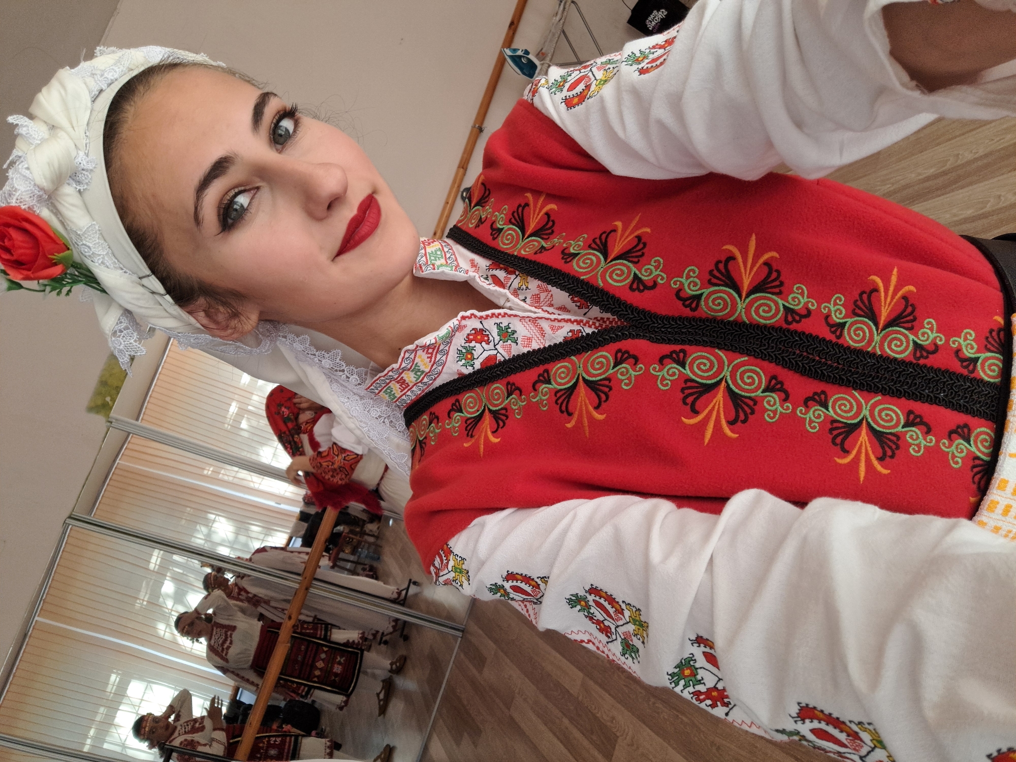 A young woman is wearing a traditional Bulgarian folk costume. She is likely in a performance setting, as evidenced by the multiple reflections in a mirror of other women similarly dressed in the background. The woman is wearing a white headscarf decorated with a red flower and is wearing red lipstick. Her costume consists of a white shirt with colorful embroidery along the sleeves and a red vest adorned with black, green, and orange detailing. The scene is likely in Lokorsko, Bulgaria, based on the traditional clothing.