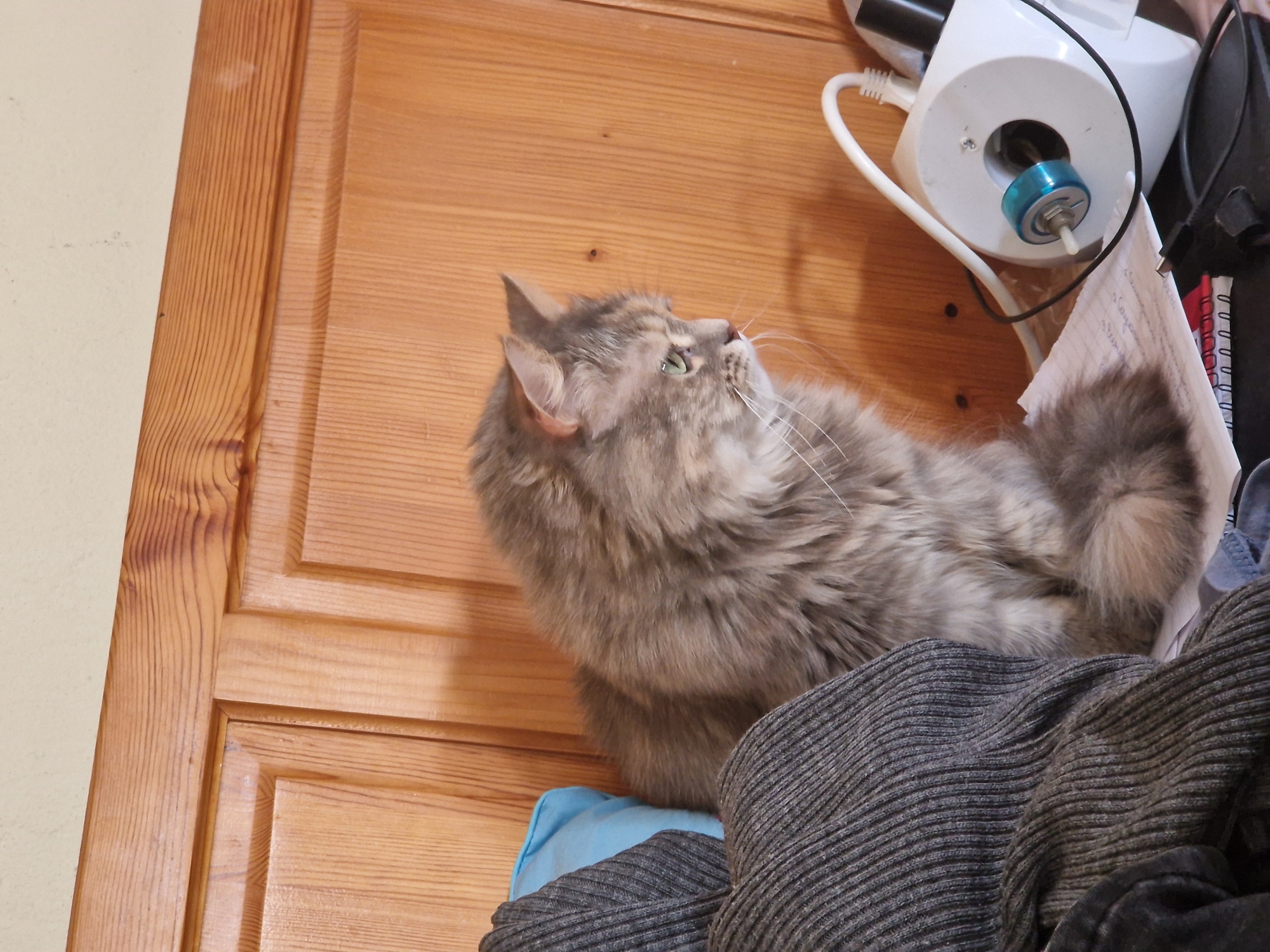 A medium-angle shot depicts a fluffy gray cat sitting amongst clothing and miscellaneous objects, possibly on top of a dresser or shelf. The cat is oriented with its head towards the upper right and its body angled down and to the right. The wooden surface of the dresser or shelf is visible behind the cat. To the right of the cat is a white electronic device with a cord, alongside a notepad and other items. Gray and blue clothing items are visible at the bottom of the frame. The location, Raduvene, Bulgaria, is only by assumption as there is no corroborating context.