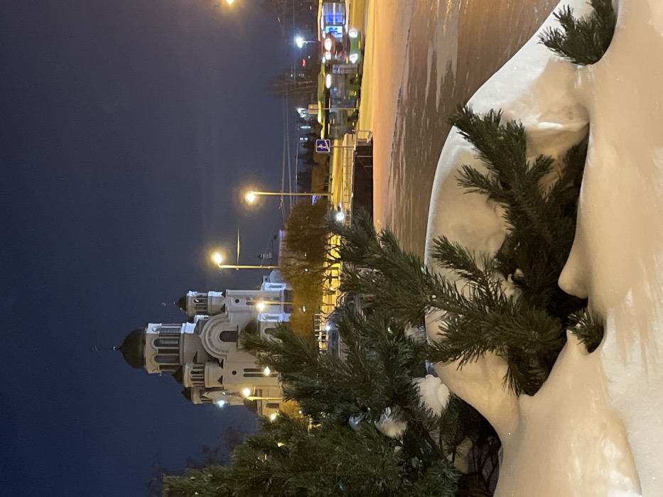 At night, a white building with multiple domes rises against a dark sky. Streetlights illuminate the scene, and a pedestrian crossing sign is visible in the distance. In the foreground, snow-covered bushes or decorations are present, with snow prominently displayed. The photograph is rotated, with the right side appearing to be the top.