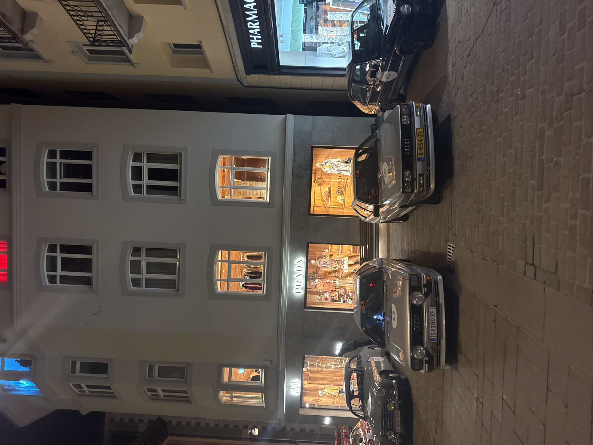 This nighttime image depicts a street in Sankt Moritz, Switzerland, showcasing vintage rally vehicles parked on a wet cobblestone surface in front of illuminated buildings. The central structure is a multi-story, light-colored building. Its ground floor houses a Prada boutique, identifiable by its prominent signage and multiple display windows exhibiting mannequins, clothing, and accessories. Upper floors feature arched windows; one on the first floor displays clothing racks, while a corner turret window is illuminated with a blue light, revealing a silhouetted figure. A top-floor window shows a red internal light. Adjacent to the right, a yellow-toned building features a 'PHARMACY' on its ground level and an upper-floor balcony with an iron railing. A dark, stone-faced building is partially visible on the far left. Four distinct classic/vintage cars, each marked with a white circular rally number, are parked parallel to the Prada building. From left to right: 1. A dark grey/silver vintage coupe or convertible (German plate "D-AHX-081", number "52") equipped with yellow fog lights. 2. A silver Audi Quattro (Swiss plate "S-280 XF", number "53"). 3. A silver Audi Quattro (Dutch plate "K-854-ZL", number "58"). 4. A black Volkswagen Golf hatchback (number "60"). One individual is partially visible, bent over between the vintage coupe and the Audi "53". The overall illumination originates from interior building lights and storefronts, casting reflections on the damp cobblestone street.
