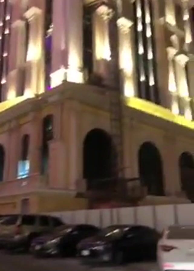 street scene at night. The camera pans upwards, revealing several buildings illuminated with lights. Cars are parked along the street, and there is some traffic. In the distance, a tall skyscraper is visible, highlighted by blue laser beams. The overall setting appears to be an urban area with a combination of modern and traditional architecture.