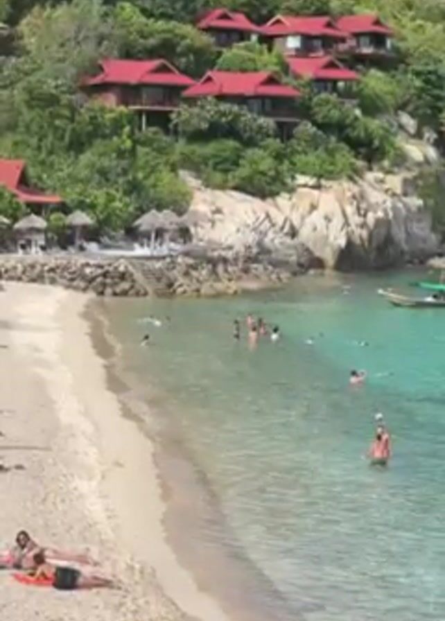 The video presents a sunny beach scene, likely filmed from an elevated position. The beach has a sandy shoreline where several people are sunbathing and relaxing. The water is clear and turquoise, with people swimming and wading. In the background, nestled into the hillside, are several buildings with distinct red roofs. There are patches of greenery interspersed with rock formations along the hillside. A small boat is anchored in the water to the right.